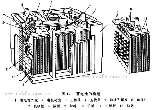 為增大蓄電池的容量,將多片正、負極板分別并聯焊接,組成正、負極板組,如圖1-1。橫板上聯有極柱,各片間留有空隙。安裝時正負極板相互嵌合,中間插入隔板。由于正極板的力學性能差,所以,在每個單體電池中,負極板的數量總比正極板多一片,這樣正極板都處于負極板之間,使其兩側放電均勻,不致造成正極板拱曲變形。