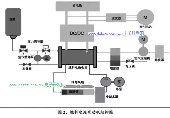 燃料電池堆。為了滿足一定的輸出功率和輸出電壓的需求,通常將燃料電池(FC)單體按照一定的方式組合在一起構(gòu)成燃料電池堆,并配置相應(yīng)的輔助設(shè)備(BOP,Balance Of Plant),同時(shí)在燃料電池控制單元的控制下,實(shí)現(xiàn)燃料電池的正常運(yùn)行,共同構(gòu)成了燃料電池系統(tǒng)。用作車輛動(dòng)力源的燃料電池系統(tǒng),稱為燃料電池發(fā)動(dòng)機(jī)。燃料電池堆是燃料電池發(fā)動(dòng)機(jī)的核心,BOP維持電堆持續(xù)穩(wěn)定安全地運(yùn)行。燃料電池發(fā)動(dòng)機(jī)輔助系統(tǒng)主要包括空氣壓縮機(jī)、燃料電池用加濕器、氫氣循環(huán)泵、壓力調(diào)節(jié)器和系統(tǒng)控制單元。以氫為燃料的燃料電池發(fā)動(dòng)機(jī)的典型結(jié)構(gòu)如圖所示。