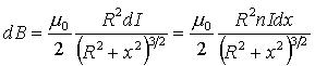 解:建立坐標系,在距P 點 x 處任意截取一小段 dx ,其線圈匝數(shù)為 。因為螺線管各小段在P點的磁感應強度的方向均沿軸線向右,所以整個螺線管在P點的磁感應強度的大小為: 因為: 代入上式得: ![]() 所以: 討論: (1)管內(nèi)軸線上中點的磁場: ![]() ![]() (2)當 L>>R時,為無限長螺線管。此時, (3)半無限長螺線管左端面(或右端面),此時: 因此: |