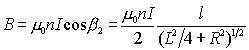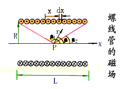 任取電流元 ,由畢-薩定律得: ,方向如圖:將dB進行正交分解: 所以有: 所以: 所以: ,方向:沿x軸正方向,與電流成右螺旋關(guān)系。討論:(1)圓心處的磁場:x=0 , (2)當 即P點遠離圓環(huán)電流時,P點的磁感應強度為: 例3:設有一密繞直螺線管。半徑為 R ,通電流 I。總長度L,總匝數(shù)N(單位長度繞有n 匝線圈),試求管內(nèi)部軸線上一點 P 處的磁感應強度。 |