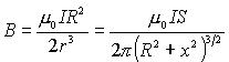 | 例2:圓形載流導線軸線上的磁場:設在真空中,有一半徑為 R ,通電流為 I 的細導線圓環(huán),求其軸線上距圓心 O 為 x 處的P點的磁感應強度。 解:建立坐標系如圖, |