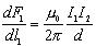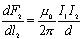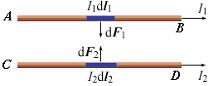 如圖:設兩導線的垂直距離為d,其中電流強度分別為I1,I2,電流方向相同,在導線CD上任取電流元I2dl2,其受力dF2 =B1I2dl2 又因為 ,且在導線CD中每一電流元受力方向相同,故其每單位長度所受力為: