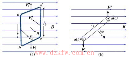 對于導線ad段和bc段,作用力的大小相等、方向相反,并且在同一直線上,所以它們的合力及合力矩都為零。而導線ab段和cd段所受磁場作用力的大小則分別為: