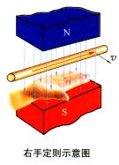 若磁通量的變化是由導(dǎo)體切割磁感線引起的,感應(yīng)電流的方向、磁感線方向、導(dǎo)體運(yùn)動(dòng)方向三者之間有一個(gè)更便于記憶的簡(jiǎn)單關(guān)系:伸開右手,讓拇指與其余四指在同一個(gè)平面內(nèi),使拇指與并攏的四指垂直;讓磁感線垂直穿入手心,使拇指指向?qū)w運(yùn)動(dòng)的方向,其余四指所指的方向就是感應(yīng)電流的方向(圖)。這就是右手定則(right-hand rule)。