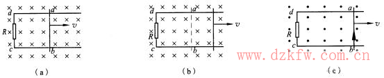如圖(a)所示,矩形線框abcd的平面跟磁場(chǎng)垂直,設(shè)整個(gè)線框的等效電阻為R。當(dāng)線框的ab邊在da、cb兩條平行邊上向右滑動(dòng)時(shí),ab邊中感應(yīng)電流的方向怎樣?如果把a(bǔ)b邊看成一個(gè)電源,a、b兩端哪一端相當(dāng)于電源的正極?