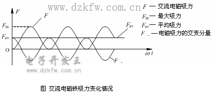 當線圈中通以直流電時,氣隙磁感應強度不變, 直流電磁鐵的電磁吸力 為恒值。當線圈中通以交流電時,磁感應強度為交變量,交流電磁鐵的電磁吸力 F 在 0 (最小值)~ F m (最大值)之間變化,其吸力曲線如下圖所示。在一個周期內,當電磁吸力的瞬時值大于反力時,銜鐵吸合;當電磁吸力的瞬時值小于反力時,銜鐵釋放。所以電源電壓每變化一個周期,電磁鐵吸合兩次、釋放兩次,使電磁機構產生劇烈的振動和噪聲,因而不能正常工作。