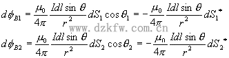 在磁感應(yīng)線穿入處取一面元dS1,穿出處取另一面元dS2,IdL產(chǎn)生的磁場通過兩面元的磁感應(yīng)通量分別為: