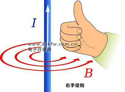 這里需要說明一點是:導體為直線時,根據右手定則可知,大拇指所指方向為電流方向,四指彎曲所指方向為磁場方向,這里的磁場方向不代表磁極方向。關于磁極方向,可以從導線彎曲的繞組(下圖)中看出,大拇指所指方向則為磁場的磁極方向。即正極(N極)