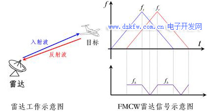雷達發射頻率隨時間變化的三角波信號,該信號經目標反射之后被雷達接收。因為發射信號和接受信號之間有一定的時間差,并且發射信號的頻率是隨時間變化的;所以在發射信號和接收信號之間有一定的頻率差;距離越大、頻差就越大。通過頻差和距離之間的某種關系,可以測得目標的距離。