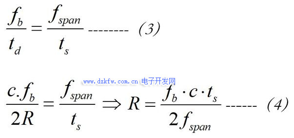 公式根據反射波和入射波的頻率差fb,可以得到距離信息。根據掃頻周期和掃頻帶寬,能計算出每赫茲頻率差、反映的距離信息。從公式可見,掃頻帶寬越寬,距離分辨率越高;同樣掃頻帶寬下,載波頻率越高(ts越小)、距離分辨率越高。在其他參數固定的情況下,距離和差頻成函數關系。