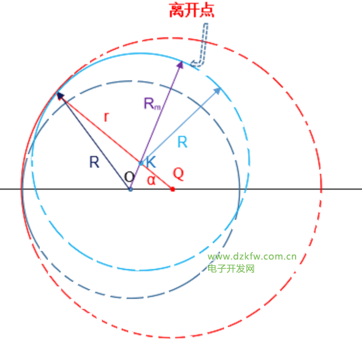 (2)問求解偏轉電極的最大厚度,一讀題會感覺無頭無腦,設身處地想想粒子在磁場中偏轉的情景,估計就會想到是問什么問題了。把自己物化為粒子,會不會有這樣的感覺?從P點往出引粒子,但偏轉器不可能在引入粒子前才安裝吧?機器設備應該是事先裝配好的,到了P點順利把粒子引出來就算完事。因此這個電極不可能在引出這個過程阻擋粒子,厚度不合適,可能阻擋粒子在前面的加速過程,否則就無法加速到P點,無粒子可引的話,偏轉器不就成了一個擺設了?          畫圖找幾何關系是通行辦法。在回旋加速器中加速時,粒子每經過電場加速一次,圓心變換一次,偏轉半徑就要增大一點,但相鄰的半徑差經過推導可知是越來越小的,作圖是需要注意這一點。