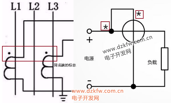 在變壓器、互感器以及功率表等的原理接線圖中,經常會在看到“﹡”或“•”符號,如下圖1-1所示。這些符號不是別的,正是同名端的標志。那么,什么是同名端呢?