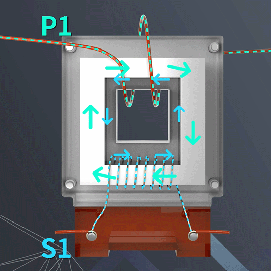 另外,在電流互感器中,兩個線圈是以減極性的方式接線的,因為只有這樣,才能在一次電流(即電源線電流)從P1穿過時,二次電流通S1端流出,如下圖1-5所示。一次電流從P1穿過,產生逆時針方向的磁場,為了阻礙原磁場的變化,二次線圈的感應電流會產生順時針方向的磁場,即此時二次線圈的感應電流從S2端流入,從S1端流出。