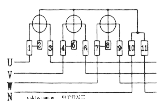 首先看一下圖中的幾個圖例。接線口我們用阿拉伯數字標記了出來,分別是一到十一。三根火線我們用三個不同的字母,U,V,W來表示,零線用N來表示。那我們一根一根來接,一個個接線口來接。