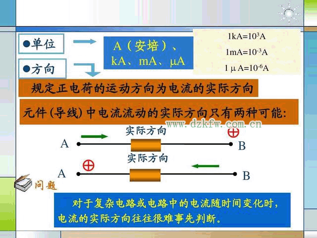 2.電流強度:衡量電流強弱的物理量。單位時間內通過導體截面積的電量即為電流強度,用字母 I 表示,習慣上簡稱為電流。