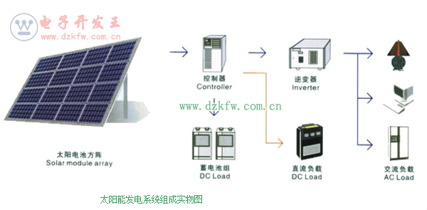 在太陽光的照射下,將太陽電池元件產生的電能通過控制器的控制給蓄電池充電或者在滿足負載需求的情況下直接給負載供電,如果日照不足或者在夜間則由蓄電池在控制器的控制下給直流負載供電,對于含有交流負載的太陽能發電系統而言,還需要增加逆變器將直流電轉換成交流電。