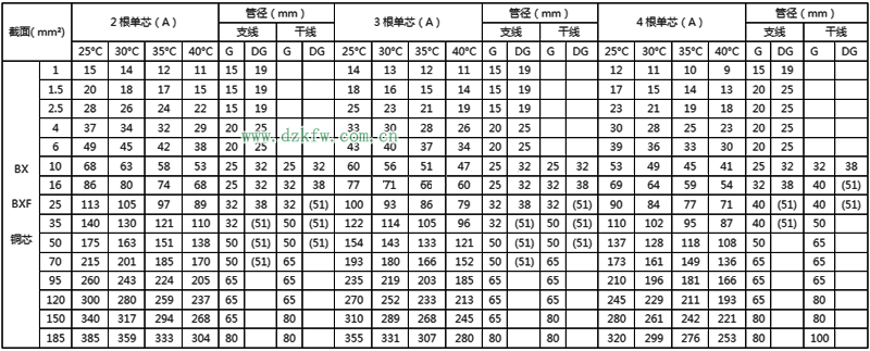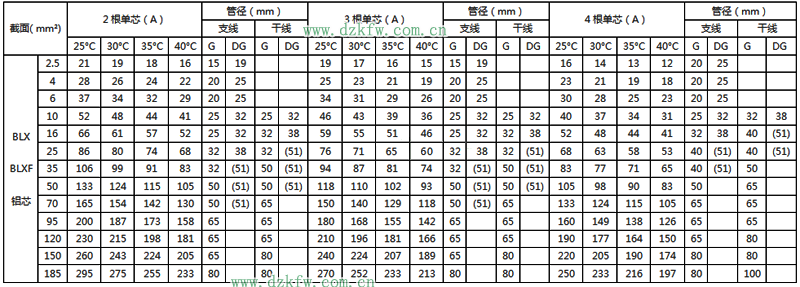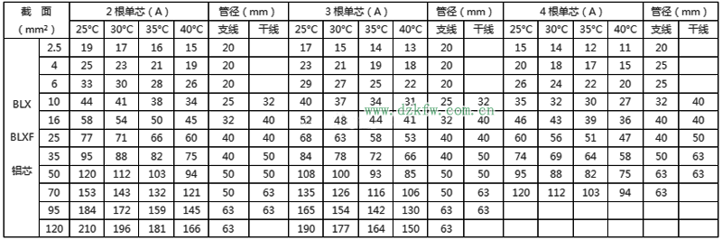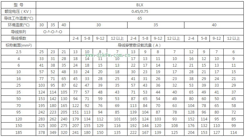 BLX絕緣電線明敷及穿線管時(shí)持續(xù)載流量對(duì)照表