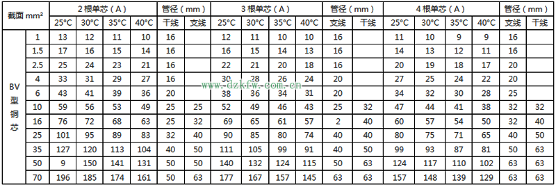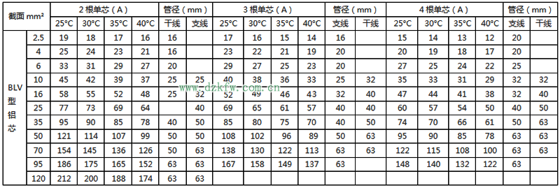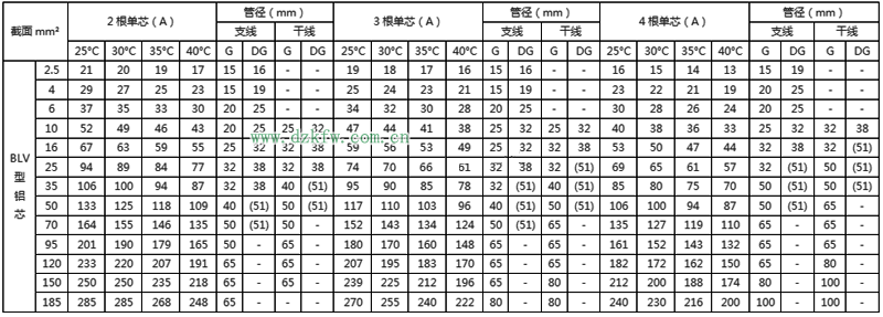 BLV絕緣電線明敷及穿線管時(shí)持續(xù)載流量對(duì)照表
