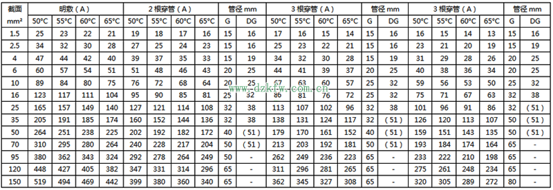 注:明敷載流量值系根據(jù)S>2De(De為電線外徑)計(jì)算