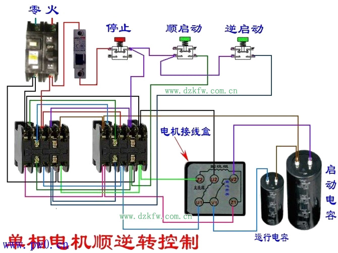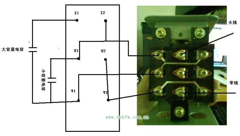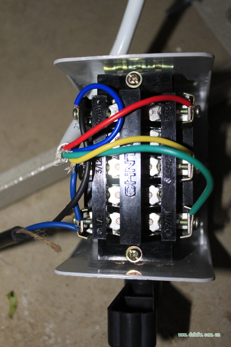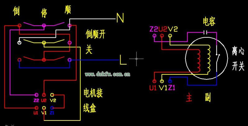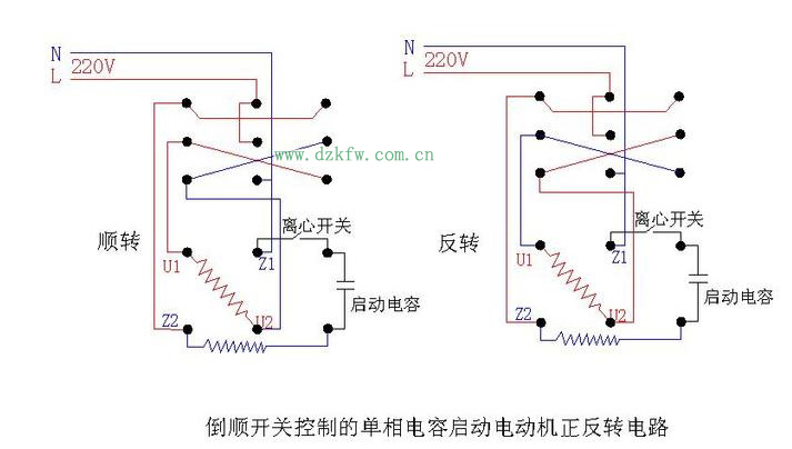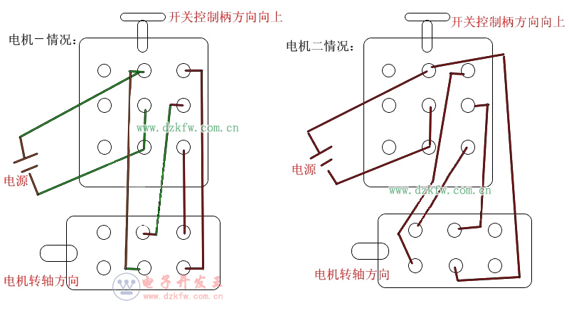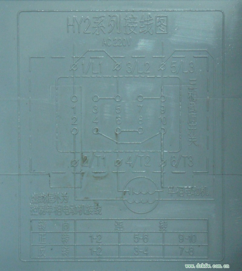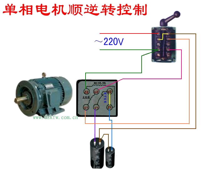 注明:此圖是簡單式接線方法,上面的9個(gè)圓點(diǎn)的是倒順開關(guān),接線時(shí)開關(guān)柄朝上。下面6個(gè)圓點(diǎn)的是電機(jī),電機(jī)轉(zhuǎn)軸方向向左。一般電機(jī)接好后試機(jī),倒順兩個(gè)方向都要試一下,如電機(jī)有異樣應(yīng)注意隨時(shí)拔掉插頭。另外:注意安全!