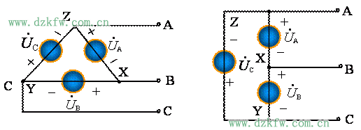 圖1 三相電源的Y形聯接                                                              圖2 三相電源的△形聯接