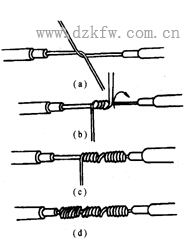 ① 單股銅芯導(dǎo)線的直接連接 先把兩線端X形相交,如圖1(a)所示;互相絞合2~3圈,如圖1(b)所示;然后扳直兩線端,將每線端在線芯上緊貼并繞6圈,如圖1(c)、(d)所示。多余的線端剪去,并鉗平切口毛刺。