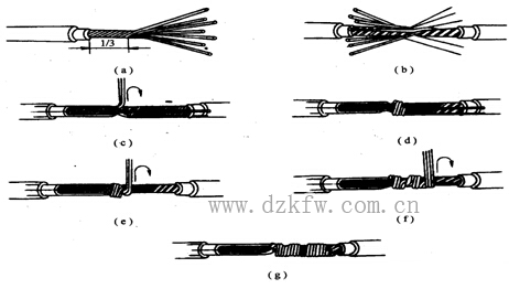 ④ 19股銅芯導(dǎo)線的直接連接 連接方法與7股芯線的基本相同,芯線太多,可剪去中間的幾股芯線,纏接后,在連接處尚須進行釬焊,以增強其機械強度和改善導(dǎo)電性能。