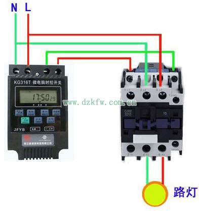 如圖,時控開關左邊兩個接線柱是進線,接電源220伏電源,右邊兩個接線柱是輸出,接接觸器線圈。(當然,接觸器要選擇220V線圈電壓。)設置好開燈和關燈時間,關于時控開關時間設置,前面視頻詳細介紹過,這里就不再介紹。到開燈時間時,時控開關輸出給接觸器線圈,接觸器吸合,主觸點閉合,路燈亮。到關燈時間后,時控開關斷開,接觸器釋放,路燈滅。