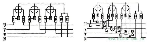 上圖(左)為三相四線有功電表直接接入,火線U、V、W分別接在1、4、7端,3、6、9端接負(fù)載,零線接10號端,11號端接負(fù)載另一端。