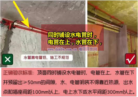 電管與水管在同時(shí)鋪設(shè)時(shí),遵循‘電管在上,水管在下’的原則,避免水路損壞時(shí)引發(fā)電路的安全問(wèn)題。