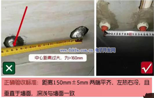 水電改造水路的冷熱出水口按照左熱右冷來(lái)施工,冷水和熱水出水口之間相距150mm左右。保證冷熱出水口在同一平行線(xiàn)上,與墻面垂直。