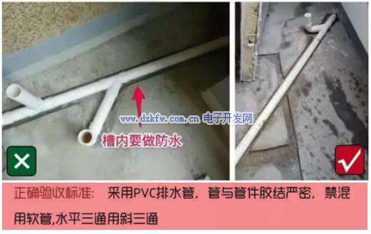 千萬(wàn)注意,下水管道施工時(shí),管槽同樣需要做防水處理。材料使用PVC水管,防止混用軟管。