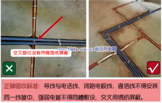 強(qiáng)電個(gè)弱電線(xiàn)管不能同槽鋪設(shè)。當(dāng)電路鋪設(shè)過(guò)程中,強(qiáng)電和弱電線(xiàn)管發(fā)生交匯時(shí),需要裹上一層錫紙進(jìn)行隔離,避免強(qiáng)電和弱電電流造成干擾。