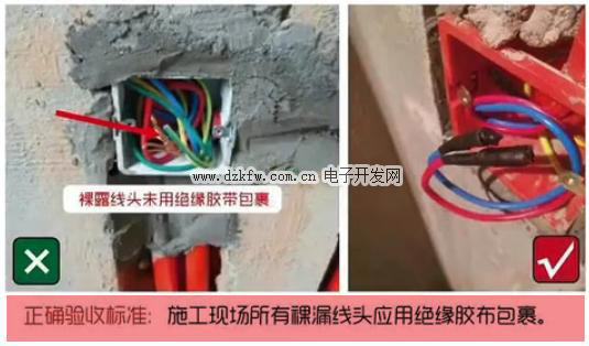 在沒(méi)有安裝插座開(kāi)關(guān)等電器時(shí),水電改造完成的裸露線(xiàn)頭一定要用絕緣膠帶包裹起來(lái)。