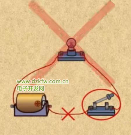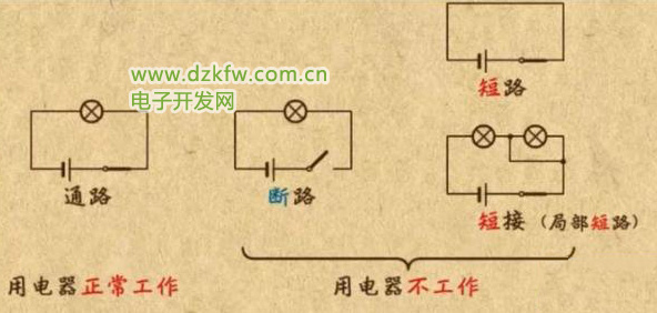 斷開的電路叫開路(也叫斷路),特點是電路中沒有電流通過,用電器不能工作;