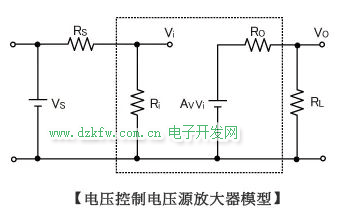 運算放大器要求的功能有高輸入電阻(阻抗)和低輸出電阻。在下圖【電壓控制電壓源放大器模型】中,輸入電壓和輸出電壓的關系如以下公式所示。