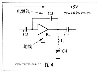 電路工作過程如下:話音信號被駐極體話筒BM接收轉換為電信號后,通過耦合電容C1輸入到晶體管VT基極。R1為BM的負載電阻。晶體管VT等構成電壓放大器,將C1耦合過來的音頻信號放大后,經C2耦合輸出。R2為基極電阻,R3為集電極電阻。集成電路IC等構成高頻振蕩器,振蕩頻率由L、C4串聯諧振回路決定,C4是微調電容,用于調節振蕩頻率。C3為反饋電容。C2耦合過來的音頻信號對高頻振蕩信號進行頻率調制,調頻信號經C5耦合至天線W發射出去。