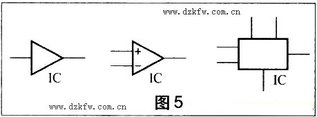 集成放大器、電壓比較器等習慣上用三角形框圖表示,其他集成電路習慣上用矩形框圖表示,如圖5所示。其左側為輸入端,右側為輸出端。