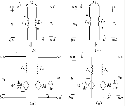例如,對圖(a),當i1、i2分別由端紐a和d流入(或流出)時,它們各自產生的磁通相助,因此a端和d端是同名端(當然b端和c端也是同名端);a端與c端(或b端與d端)稱異名端。有了同名端規定后,像圖4(a)所示的互感線圈在電路中可以用圖4(b)所示的模型表示,在圖(b)中,設電流i1、i2分別從a、d端流入,磁通相助,如果再設各線圈的 u、i為關聯參考方向,那么兩線圈上的電壓分別為 |