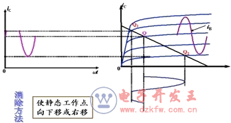 消除飽和失真的方法:       降低靜態工作點的位置,以及適當減少輸入信號ui的幅值。                                         消除飽和失真的方法