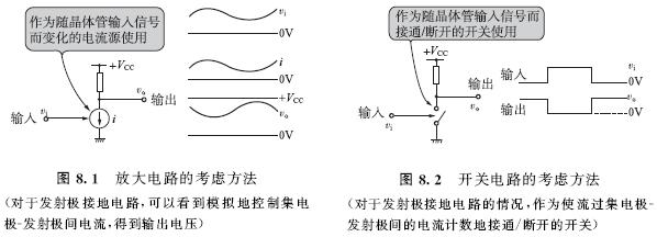 圖8.1是一例發(fā)射極接地放大電路,這種電路能夠通過輸入信號(hào)(電壓)連續(xù)地——— 模擬地控制流過集電極發(fā)射極間電流,獲得輸出電壓。