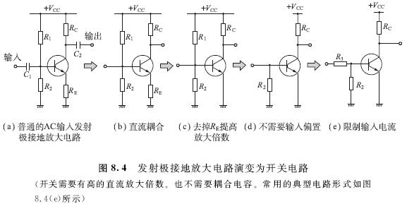 8.4是從發(fā)射極放大電路演變到開關(guān)電路的示意圖 。首先為了獲得直流增益(放大倍數(shù)),從圖8.4(a)的一般發(fā)射極放大電路中去掉輸入輸出的耦合電容C1、C2,得到圖8.4(b)的電路。進(jìn)一步為了提高放大倍數(shù),去掉發(fā)射極電阻E,變成圖8.4(c)的電路。這樣一來,也就沒有必要加基極偏置電壓。當(dāng)輸入信號(hào)為0V時(shí),晶體管處于截止?fàn)顟B(tài) ,所以集電極就沒有必要流過無用的電流——— 空載電流。因此, 如圖 8.4(d)所示去掉偏置用的R1。