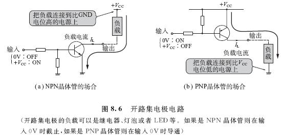 如圖8.6所示,在使用NPN晶體管的電路中,如果在電位高于GND的電源與集電極(輸出端)之間連接負(fù)載,這時(shí)就像是吸入負(fù)載電流。在使用PNP晶體管的電路中,如果在比正電源電位低的電源(在圖8.6(b)中是GND)與集電極間連接負(fù)載,這 時(shí)就像負(fù)載電流在流出。因此,這個(gè)開路集電極能夠接通/斷開負(fù)載電流而與負(fù)載連接幾伏的電源沒有關(guān)系,所以是一個(gè)對于開關(guān)外部負(fù)載非常方便的電路。