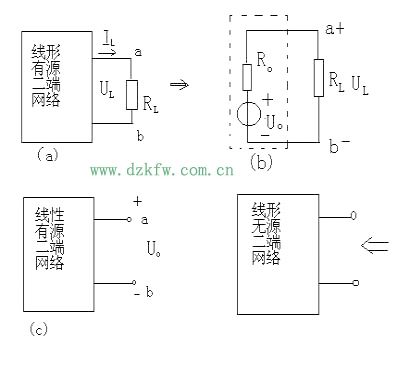 圖(a)實線框是一個線形有源二端網(wǎng)絡(luò),框外 所在的ab支路可廣義的視為外電路或負(fù)載電路。如果將ab支路斷開或移去如圖(c)所示,則a,b兩端點間的開路電壓就是戴維南等效電路(圖(b)虛線框內(nèi))的電壓源 ;再令有源二端網(wǎng)絡(luò)中的獨立電源置零,即電壓源用短路線代替,電流源用斷路代替,則形成的無源二端網(wǎng)絡(luò)中,a,b兩端點間的等效電阻就是Ro如圖所示當(dāng)有源二端網(wǎng)絡(luò)的戴維南等效電求得以后,則由該有源二端網(wǎng)絡(luò)所提供的負(fù)載電流和其兩端的電壓可由下式求出: