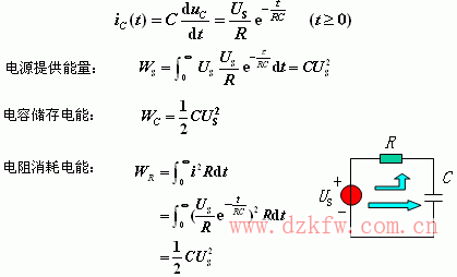 電源提供的能量一半消耗在電阻上,一半轉換成電場能量儲存在電容中,也就是說,充電效率為50%。