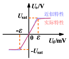 | ①線性工作區(qū): 此時 則 ②正向飽和區(qū): 此時 則 ③反向飽和區(qū): 此時 則 式中e是一個數值很小的電壓,例如Usat=13V, A =105 時,則e =0.13mV 。 | |