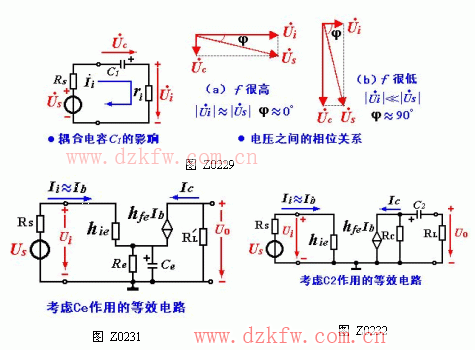 在低頻范圍內,C1C2Ce容抗增大,不能忽略。CiCo及電容CieCc 的容抗很大仍可視為開路。此時的微變等效電路如圖 Z0229、Z0230、Z0231、Z0232所示。