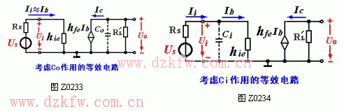 放大電路在高頻段時也可惜助h參數微變等效電路來分析,其徽變等效電路如圖Z0233、Z0234所示。C1C2Ce的容抗較小均可視為短路,而CiCo及電容CieCe的容抗也較小,其分流作用不可忽略。且這種影響隨著頻率的增高更加明顯。同時,它們引起的附加相移也隨著頻率的增高而增大,當f → ∞時,附加相移接近 - 270°。