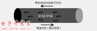 電流方向的確定物質(zhì)中帶電粒子定向有規(guī)則的移動(dòng)就形成電流。習(xí)慣上吧正電荷移動(dòng)的方向規(guī)定為電流的實(shí)際方向。但應(yīng)當(dāng)指出的是,在金屬導(dǎo)體中導(dǎo)電的是自由電子,它帶負(fù)電,因此它的移動(dòng)方向正好與規(guī)定的電流方向相反。如下圖所示:
