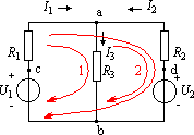 (3)存在由幾條支路組成的閉合回路,如abca, adba, adbca(紅線為回路繞行方向)。其中,回路1和回路2沒有被支路分割,這樣的回路稱獨立回路,又稱為網孔。